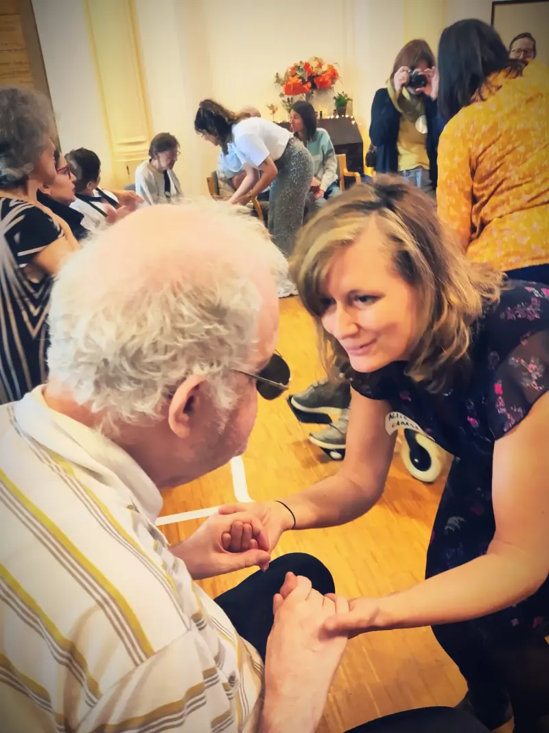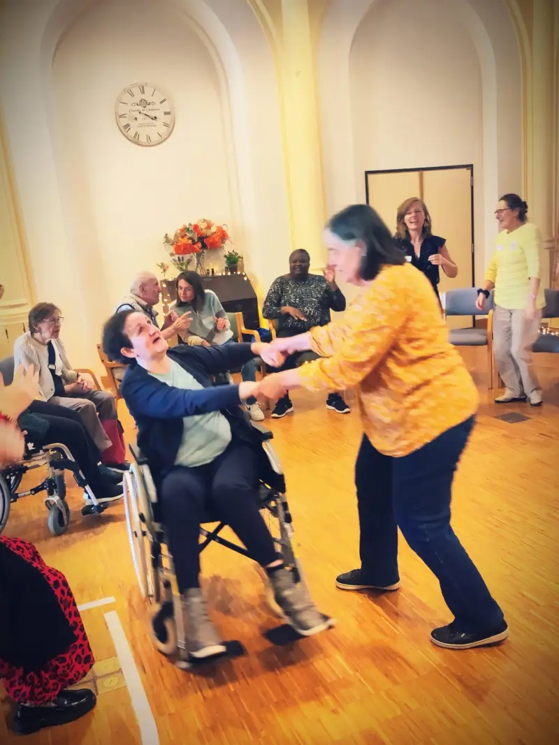 Tout en douceur, sur de la musique, nous avons commencé à bouger les bras, les jambes, la tête… Tout le corps, assis sur une chaise. Puis la musique s’est emballée, et Clara nous à invités à danser au milieu du cercle et à inviter une personne. Ce fut un moment magique, de bonheur, ou des couples improbables se sont formés et ont dansé. Un moment de communion !