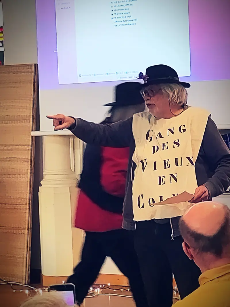 Ensuite, Mirko et une partie du gang des Vieux en colère sont montés sur scène et nous ont présenté quelques extraits de leur cabaret. Ce groupe de pensionnés engagés et militants s’invite dans la sphère publique par des actions coup de poing au service de batailles sociétales par exemples : la raréfaction des guichets de banque qui rend l’accès au cash inaccessible ; le démantèlement de la sécurité sociale et le statut de la Grappa qui durcit les règles pour pouvoir en bénéficier ; le prix du transport en train pour les personnes âgées de 65 ans et plus, qui va être supprimé prochainement et qui sera à l’avenir beaucoup plus cher.